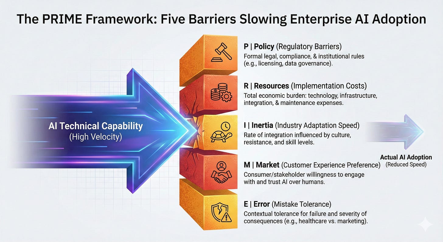 The framework identifies five categories of barriers—Policy, Resources, Inertia, Market acceptance, and Error tolerance (forming the acronym PRIME). Each operates independently, but their combined effect determines deployment velocity and ultimate impact on work: